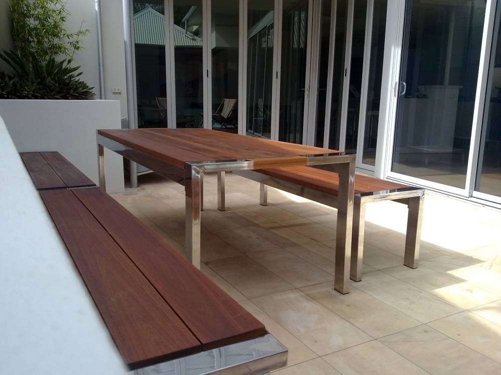 Instead of mixing bench and chair seating like American TV styling often suggests, Russell keeps layouts intentional, balanced, and functional. Frames may include stainless steel elements, powder coated to suit your aesthetic, paired with hardwood tops in Jarrah or Blackbutt for a long life outdoors.